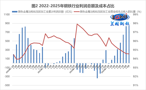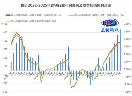 从全国粗钢产量及吨钢利润的数据来看,2025年1-9月国内钢铁生产企业处于“控产扩利”的局面,吨钢盈利130元,较上年同期增加174元(详见图1)。从营业成本来看,1-9月环比继续走弱,但仍处相对高位,1-9月营业成本占营业收入的比重为94.5%,较上年同期下降2.3个百分点(详见图2)。从钢企利润率来看,1-9月钢企盈利能力持续增强,成本利润率为1.79%,较上年同期上升2.39个百分点;销售利润率为1.69%,较上年同期上升2.27个百分点(详见图3)。
