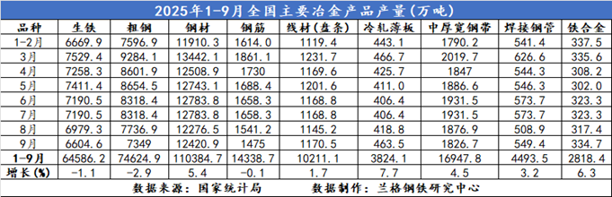 2025年1-9月,全国生铁、粗钢产量同比下降,但钢材产量同比上升。据国家统计局数据显示, 1-9月,我国粗钢产量7.46亿吨,同比下降2.9%,累计日产273.35万吨;生铁产量6.46亿吨、同比下降1.1%,累计日产236.58万吨;钢材产量11.04亿吨、同比增长5.4%,累计日产404.34万吨。