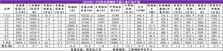 表2 2025年1-9月全国钢铁下游工业产品产量