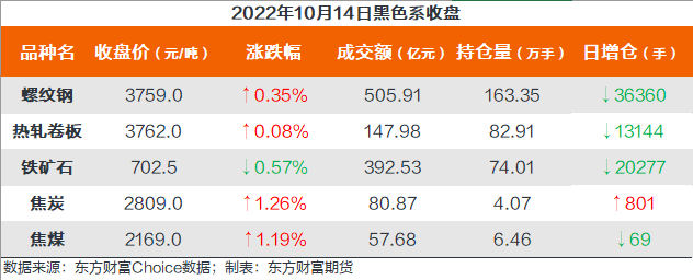 截至10月14日收盘,螺纹钢2301收3759/吨,涨0.35%;热卷2301收3762元/吨,涨0.08%;铁矿石2301收702.5元/吨,跌0.57%;焦炭2301收2809元/吨,涨1.26%;焦煤2301收2169元/吨,涨1.19%。