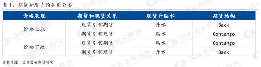 从现货升贴水和价格走势的关系上看,价格上涨有两种方式,分别是现货引领期货价格上涨和期货引领现货价格上涨;价格下跌也有两种方式,分别是现货引领期货价格下跌和期货引领现货价格下跌。但是,价格上涨的两种方式和价格下跌两种方式中,如果其价差处于极端结构时,绝对价格有可能发生反转。