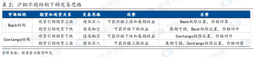 具体到交易上,不同交易结构下的交易思路主要分四种。第一,沪铜处于Back结构,如果判断现货引领期货价格上涨,则以逢低买入为主,可以获得价格和展期的收益,缺点是当Back扩大至极限位置时,价格有可能回落。第二,沪铜处于Back结构,如果判断期货引领现货价格回落,则以逢高抛空为主,可以获得价格下跌的收益,缺点是展期有亏损,且Back扩大至极限位置时,价格有可能发生反转。第三,沪铜处于Contango结构,如果判断现货引领期货价格下跌,则以逢高抛空为主,可获得价格下跌和展期收益,缺点是Contango扩大至极限位置时,价格有可能回升。第四,沪铜处于Contango结构,如果判断期货引领现货上涨,则以逢低买入为主,可以获得价格上涨收益,缺点是展期有亏损,且Contango扩大至极限位置时,价格有可能回落。