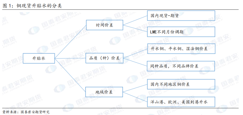 海外市场,现货升贴水主要指的是LME现货和电子盘3月合约的价差,即LME0-3现货升贴水。其他不同到期的合约之间也存在升贴水,即调期。同时,不同国家货源的流动存在到港升水的概念,如海外货源进入中国保税区存在铜溢价,即洋山港铜升水;欧洲多个国家和美国不同区域均存在到港升水。