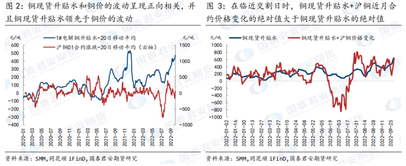 铜现货升贴水的变化和价格的关系主要表现为两个方面,一是现货升贴水和价格波动的关系,二是现货升贴水和价格走势的关系。从铜现货升贴水和价格波动的关系上看,现货升贴水和价格的波动呈现正向相关,并且现货升贴水领先于价格的波动。具体表现为铜现货升贴水走高,价格向上波动;现货升贴水回落,价格向下波动。在此过程中,需要重点关注的是铜现货升贴水在对应的期货近月合约到期时的收敛特性,在近月合约逐渐到期时,是期货向现货收敛还是现货向期货收敛?