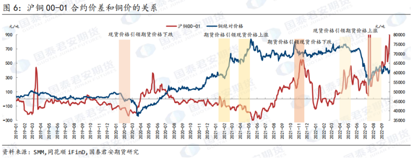 从现货升贴水和价格的关系上看,铜价上涨有两种方式。一种是现货引领期货价格上涨,这种情况下现货比较强势,处于现货升水状态,并且现货的持续上涨带动期货价格的上涨,期货的结构往往为Back结构。另一种是期货价格引领现货价格上涨,这种情况下期货价格比较强势,期货结构处于Contango结构,并且现货处于贴水状态。同时,价格下跌也有两种方式,一种是现货引领期货价格下跌,这种情况下现货比较弱势,处于现货贴水状态,并且现货价格的持续下跌带动期货价格的下跌,期限结构往往处于Contango结构。另外一种是期货引领现货价格下跌,这种情况下期货价格比较弱势,期货结构处于Back结构,并且现