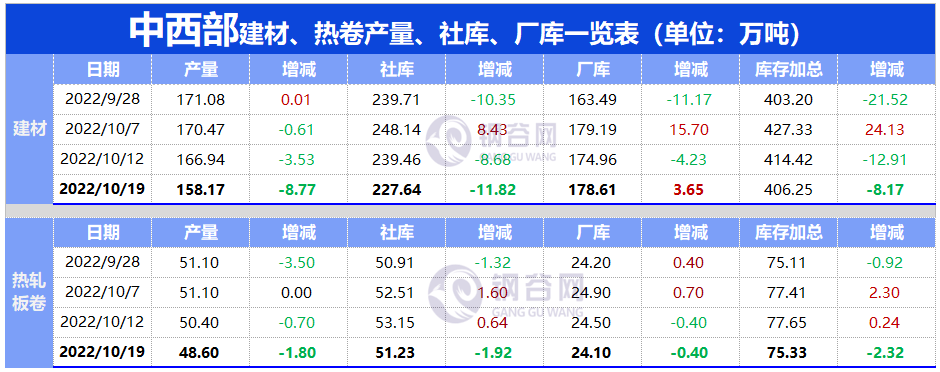 10月19日钢谷网中西部&全国钢材库存调研统计