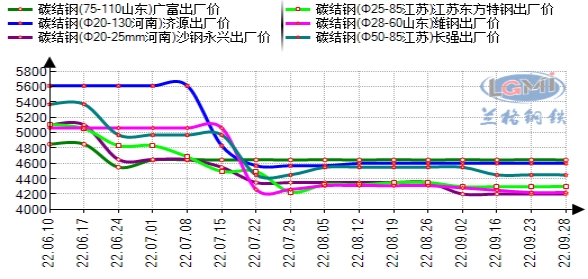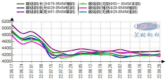 9月份国内优特钢市场价格先扬后抑。据兰格钢铁云商平台监测数据显示,截至9月29日,全国碳结钢(45#)平均价格4367元,与上月同期价格基本持平;全国合结钢(40Cr)平均价格4610元,与上月同期价格基本持平。随着高温的消退,旺季的到来,钢厂挺价意愿强烈,但成交仍处于观望状态,需求端仍是按需采购,谨慎心态并未完全消除。期货市场呈现震荡运行的态势,带动现货市场的价格,原材料成本高位坚挺,从目前市场反馈的情况来看,市场成交情况一般,商家挺价意愿增加,商户较谨慎。
