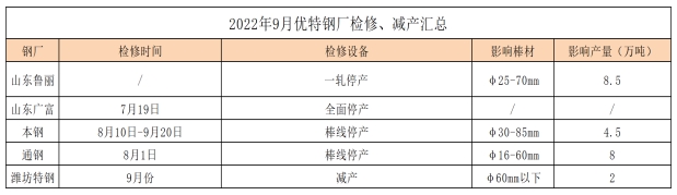 9月份钢厂出厂价格多以平稳为主,个别小幅度下调。钢厂盈利情况仍不理想,整体钢材出库困难,钢厂多以亏损为主,在资金压力较大情况下,近期钢厂考虑到厂库居高不下,成本明显亏损的情况下,各钢厂纷纷安排检修减产,具体检修情况如下: