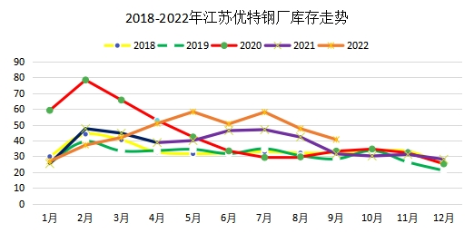 图4 2018-2022年江苏地区优特钢厂库存走势图