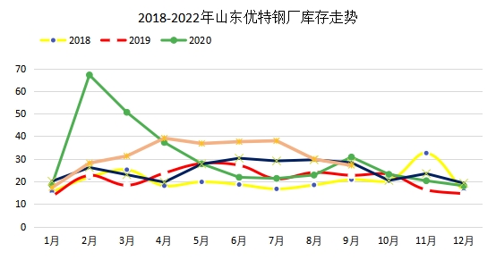 图5 2018-2022年山东地区优特钢厂库存走势图