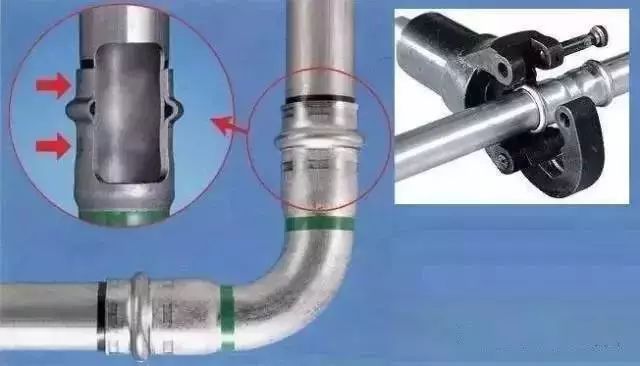 卡压式连接常见于薄壁管道的链接。其采用径向收缩外力(液压钳)将管件卡紧在管子上,并通过O型密封圈止水,达到连接效果。类似原理还有环压式连接。