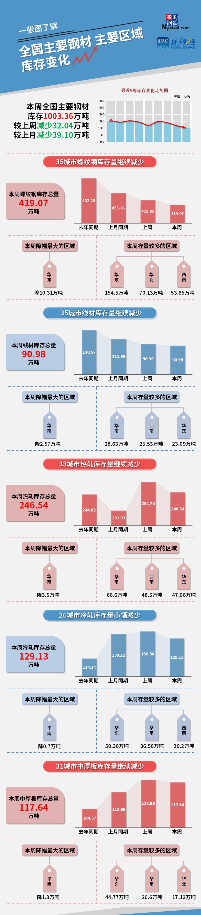 Mysteel和新华财经统计数据显示,本期(10月21日-10月27日),全国主要钢材社会库存1003.36万吨,较上一期减少32.04万吨,较上月同期减少39.10万吨;螺纹钢库存419.07万吨,较上一期减少14.88万吨。