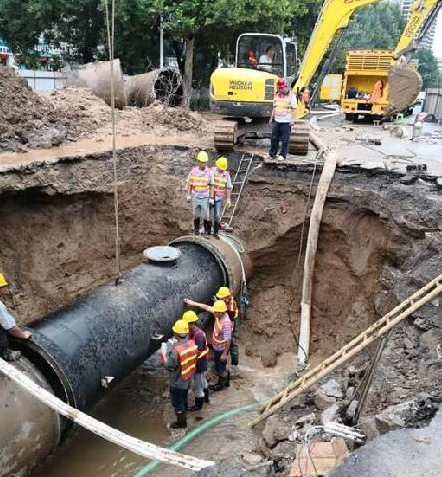 球墨铸铁管具有较高的刚性,管道配套管件种类齐全。采用哈夫节对破损管道抢修时不需要完全停水,可以实现带水作业。若管道抢修配件、闸阀与管道带压开孔设备配套使用,还可以实现带压管道的支管增设改造作业,非常适宜我国的城镇快速发展需要。