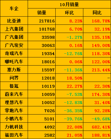 03、15家新能源车10月销量出炉,最高同比增长682.41%