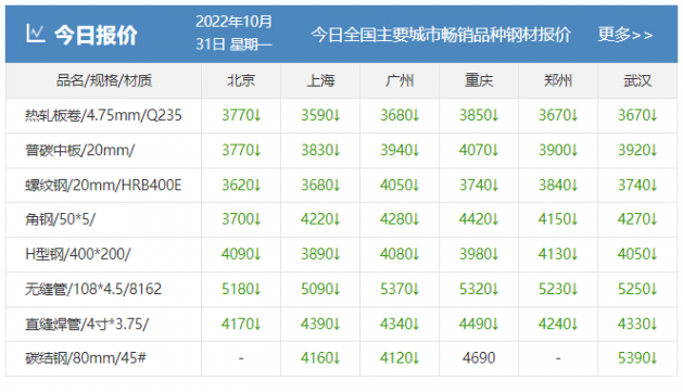 10月31日,现货价格:全面下跌(中钢网大数据库提供)