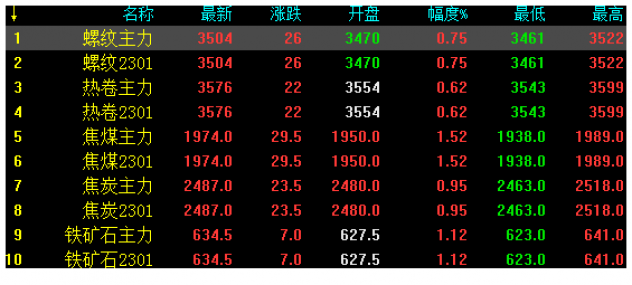 3日黑色系螺纹钢主力涨26,收报3504,涨幅0.75%;热卷主力涨22,收报3576,涨幅0.62%;焦煤主力涨29.5,收报1974,涨幅1.52%;焦炭主力涨23.5,收报2487,涨幅0.95%;铁矿石涨7,收报634.5,涨幅1.12%。