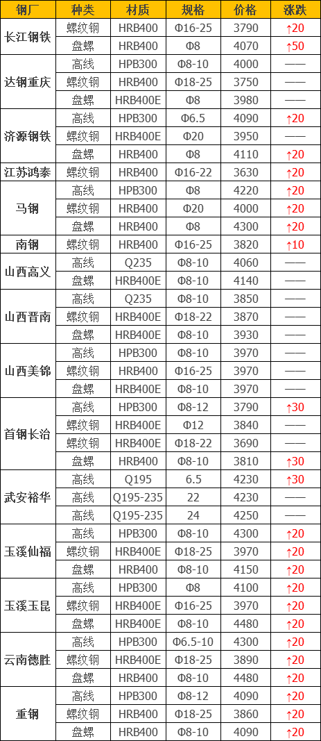 上调18家,占比66.7%,调价幅度10-50元/吨,涨幅最高为长江钢铁盘螺;