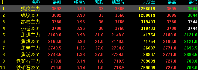 15日螺纹钢主力涨33,收报3692,涨幅0.9%;热卷主力涨36,收报3780,涨幅0.96%;焦煤主力涨21,收报2160,涨幅0.98%;焦炭主力涨37,收报2748.5,涨幅1.36%;铁矿石涨1,收报719,涨幅0.14%。
