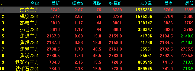 16日螺纹钢主力涨76,收报3742,涨幅2.07%;热卷主力涨44,收报3810,涨幅1.17%;焦煤主力涨19,收报2167,涨幅0.88%;焦炭主力涨46.5,收报2780.5,涨幅1.7%;铁矿石涨15.5,收报734,涨幅2.16%。