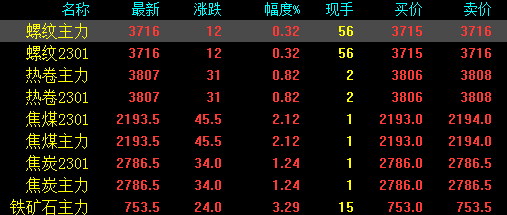 11月18日,黑色系小幅上涨。其中,铁矿石、焦煤涨势明显。此外,螺纹主力涨12收于3716,热卷主力涨31收于3807。钢坯价格走稳,收于3560。