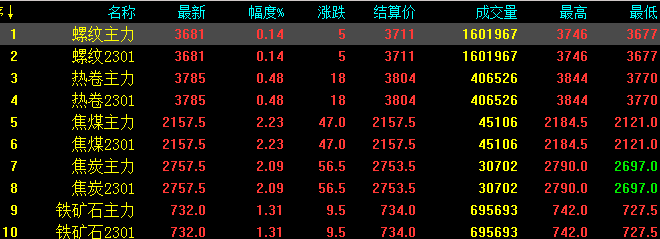 24日螺纹钢主力涨5,收报3681,涨幅0.14%;热卷主力涨18,收报3785,涨幅0.48%;焦煤主力涨47,收报2157,涨幅2.23%;焦炭主力涨56.5,收报2757.5,涨幅2.09%;铁矿石涨9.5,收报732,涨幅1.31%。