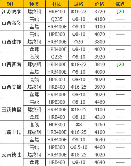 下调2家,占比10.5%,调价幅度20元/吨,跌幅最大为江苏鸿泰螺纹钢;