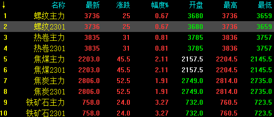 25日螺纹钢主力涨25,收报3736,涨幅0.67%;热卷主力涨31,收报3835,涨幅0.81%;焦煤主力涨45.5,收报2203,涨幅2.11%;焦炭主力涨52.5,收报2806,涨幅1.91%;铁矿石涨24,收报758,涨幅3.27%。