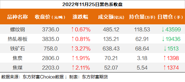 截至11月25日收盘,螺纹钢2301收3736/吨,涨0.67%;热卷2301收3835元/吨,涨0.81%;铁矿石2301收758元/吨,涨3.27%;焦炭2301收2806/吨,涨1.91%;焦煤2301收2203元/吨,涨2.11%。