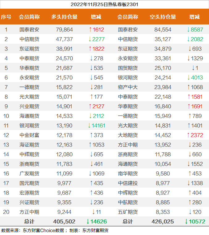 螺纹钢2301合约前20席位多单增仓1446手至72.3万余手,空单减仓46894手至71.7万余手,整体呈净多5408手。其中永安期货多单减持4576手,空单减持12838手,整体呈净空6127手。