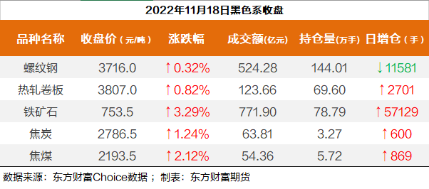 截至11月18日收盘,螺纹钢2301收3716/吨,涨0.32%;热卷2301收3807元/吨,涨0.82%;铁矿石2301收753.5元/吨,涨3.29%;焦炭2301收2786.5/吨,涨1.24%;焦煤2301收2193.5元/吨,涨2.12%。