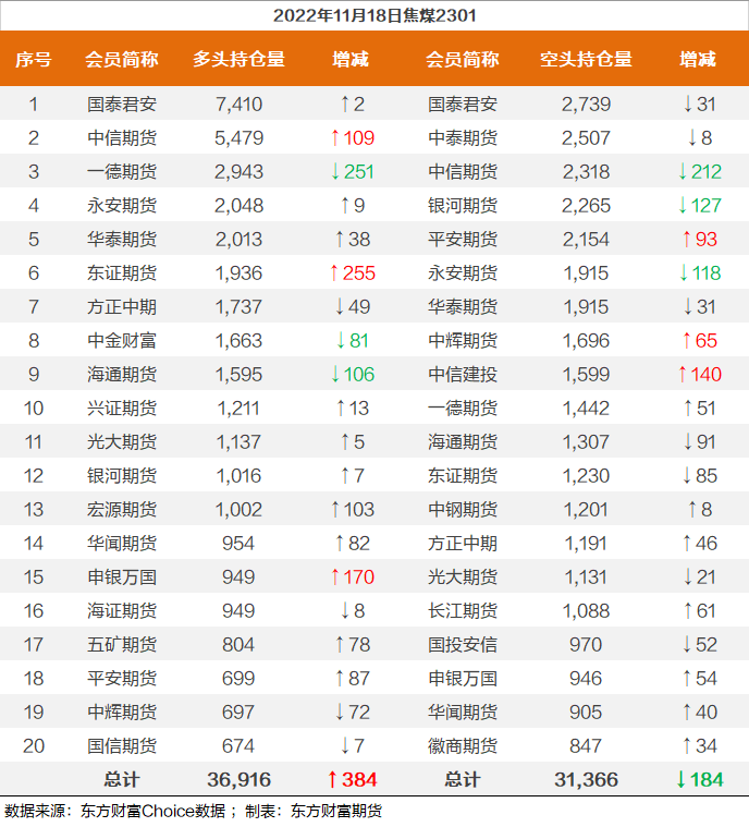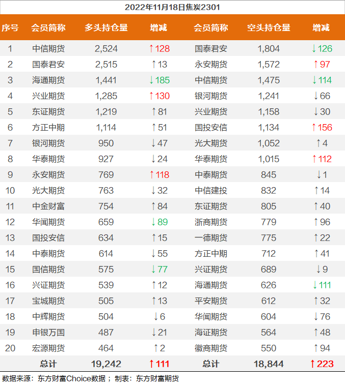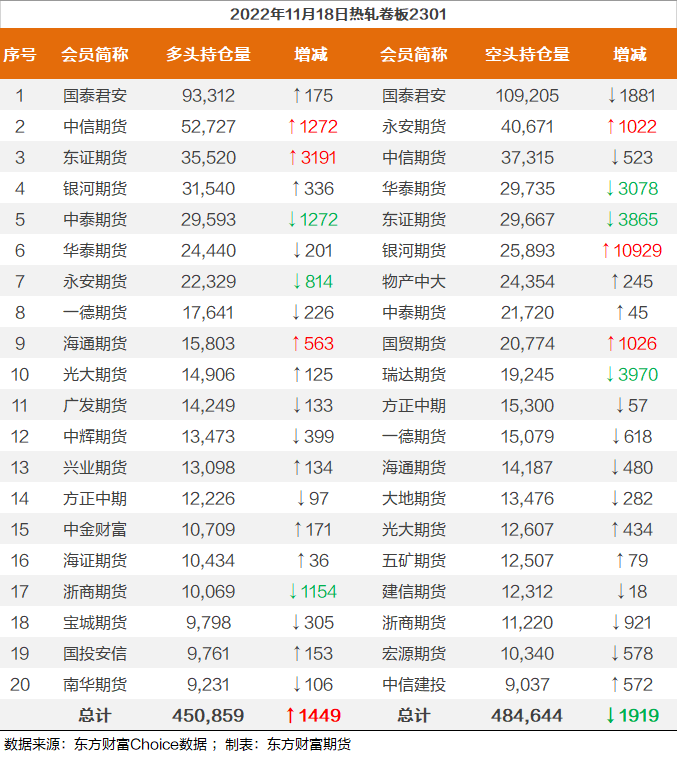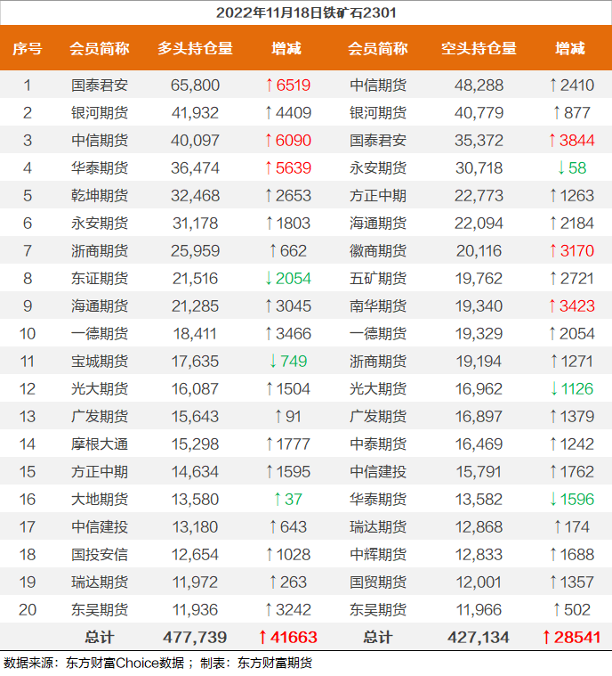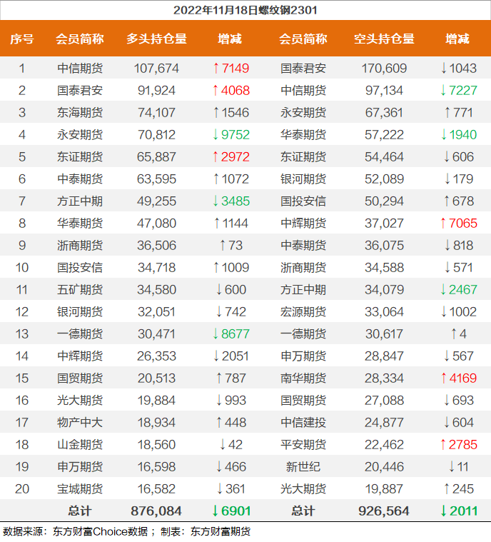 螺纹钢2301合约前20席位多单减仓6901手至87.6万余手,空单减仓2011手至92.6万余手,整体呈净空50480手。其中中信期货多单增持7149手,空单减持7227手,整体呈净多10540手。