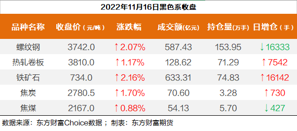截至11月16日收盘,螺纹钢2301收3742/吨,涨2.07%;热卷2301收3810元/吨,涨1.17%;铁矿石2301收734元/吨,涨2.16%;焦炭2301收2780/吨,涨1.7%;焦煤2301收2167元/吨,涨0.88%。