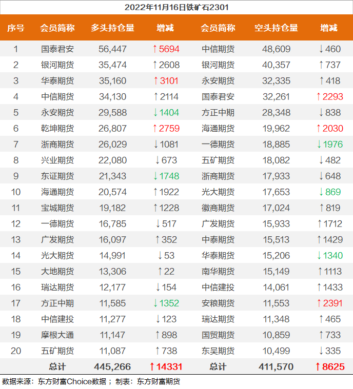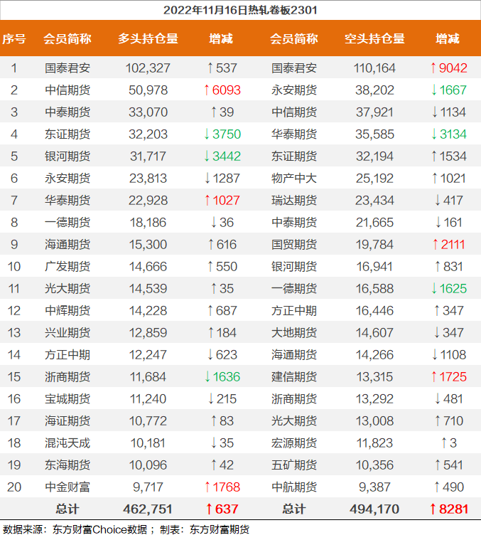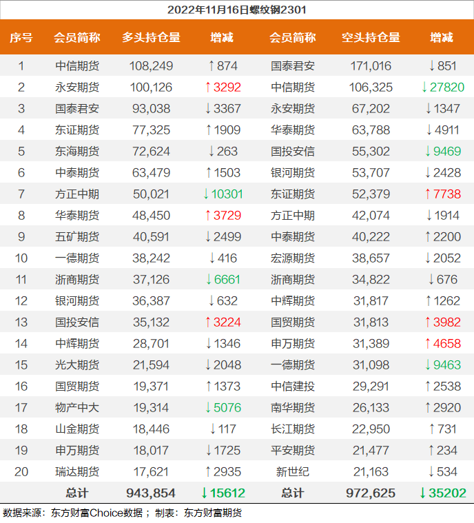 螺纹钢2301合约前20席位多单减仓15612手至94.3万余手,空单减仓35202手至97.2万余手,整体呈净空28771手。其中中信期货多单增持874手,空单减持27820手,整体呈净多1920手。