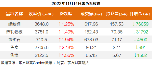 截至11月14日收盘,螺纹钢2301收3648/吨,涨1.25%;热卷2301收3751元/吨,涨1.49%;铁矿石2301收710.5元/吨,涨1.94%;焦炭2301收2705.5/吨,涨2.13%;焦煤2301收2122.5元/吨,涨1.56%。