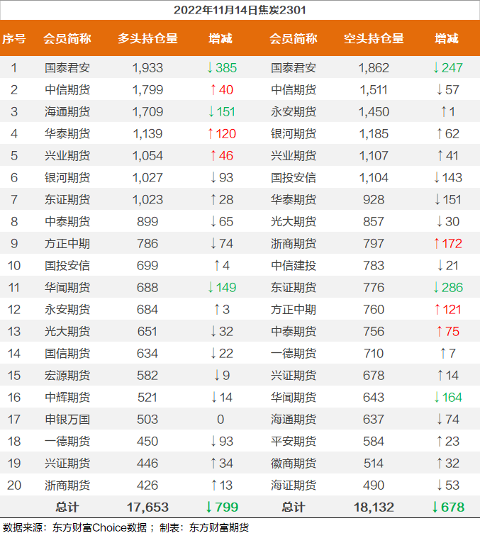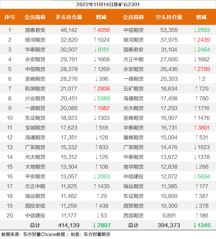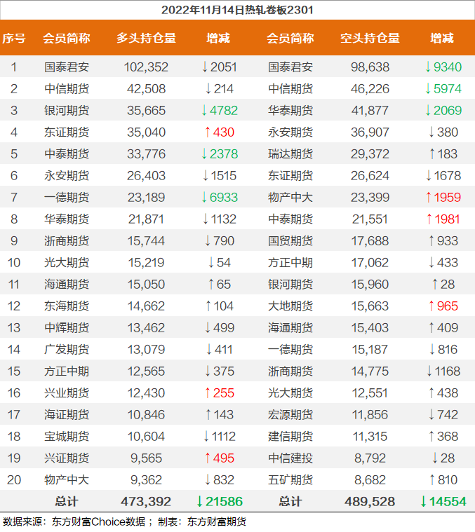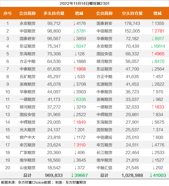 螺纹钢2301合约前20席位多单减仓39667手至96.9万余手,空单减仓41003手至102.8万余手,整体呈净空59155手。其中永安期货多单减持4176手,空单减持16614手,整体呈净多29273手。