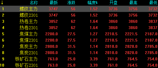 25日夜盘螺纹钢主力涨56,收报3747,涨幅1.52%;热卷主力涨62,收报3852,涨幅1.64%;焦煤主力涨27.5,收报2200,涨幅1.27%;焦炭主力涨31.5,收报2800,涨幅1.14%;铁矿石涨25,收报763,涨幅3.39%。