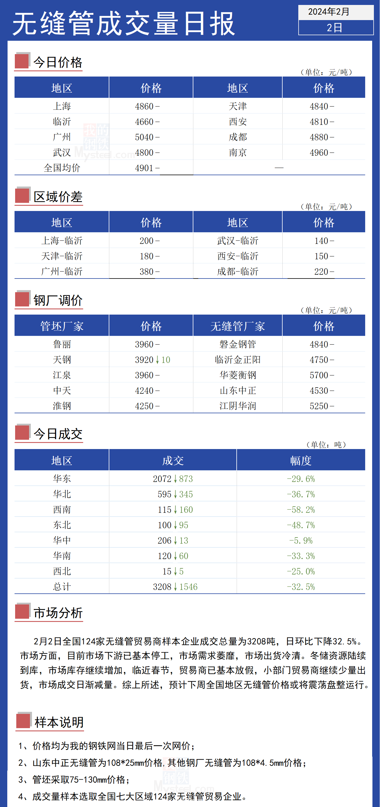 2月2日全国124家无缝管贸易商样本企业成交总量为3208吨,日环比下降32.5%,年同比下降26%。今日各区域成交量均有所下降,其中西南区域降幅较大,超58%。