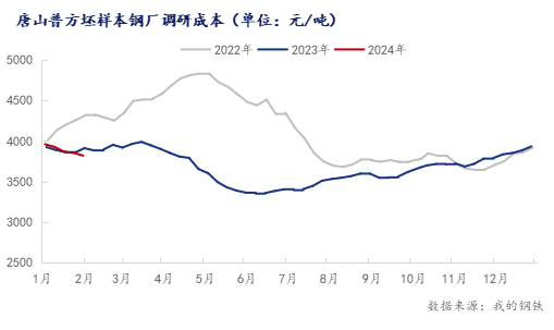 钢坯盈利情况:本周唐山主流样本钢厂平均铁水不含税成本为2976元/吨,平均钢坯含税成本3820元/吨,周环比下调34元/吨,与2月3日当前普方坯出厂价格3550元/吨相比,钢厂平均亏损270元/吨。