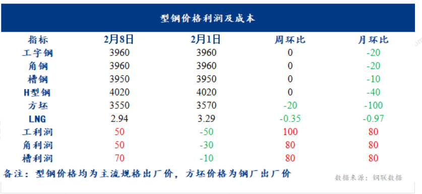 唐山型钢价格持稳运行,工、角、槽、H型钢价格持稳,原料方坯价格较上周下调20元/吨,LNG价格较上周下调0.39元/方,调坯型钢厂利润理论计算呈现薄利状态。