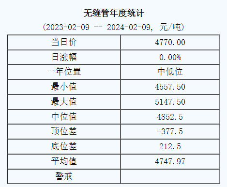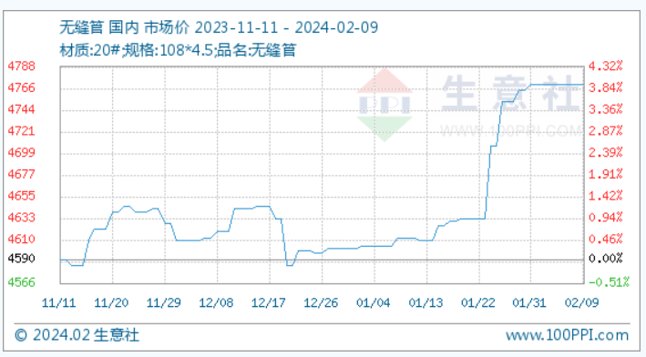 2月9日,生意社无缝管基准价为4770.00元/吨,与本月初持平。