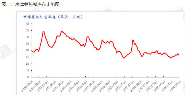 本周热轧价格持稳运行,其中天津地区热卷价格为3930元/吨;北京地区热卷价格为4130元/吨;唐山地区热卷价格为3930元/吨;邯郸地区热卷价格为3960元/吨;石家庄热卷价格为4060元/吨;较上周持平。从月环比来看,京津冀热卷价格较上月调整幅度为-30到50元/吨,从年同比来看,京津冀地区热卷价格较去年同期下调幅度为100-190元/吨。市场基本停滞,部分项目收尾,停工居多,需求释放多有不畅,随春节临近,需求基本处于冰点。库存方面,其中邯郸地区热卷库存为8.6万吨,较上周增加0.78万吨;唐山地区热卷库存为3.7万吨,较上周持平;北京地区热卷库存为0.3万吨,较上周增加0.03万吨;天津热卷库为5万吨,存较上周增加0.2万吨;石家庄热卷库存为0.57万吨,较上周增加0.03万吨。(见表二、图二)