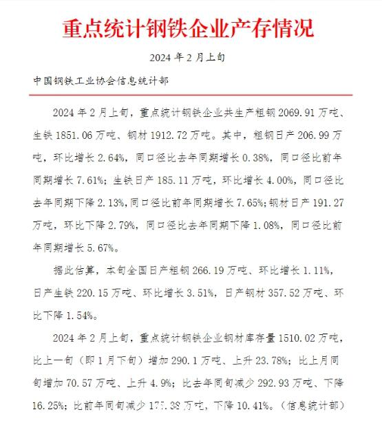 中钢协:2024年2月上旬重点钢企粗钢日产环比增长