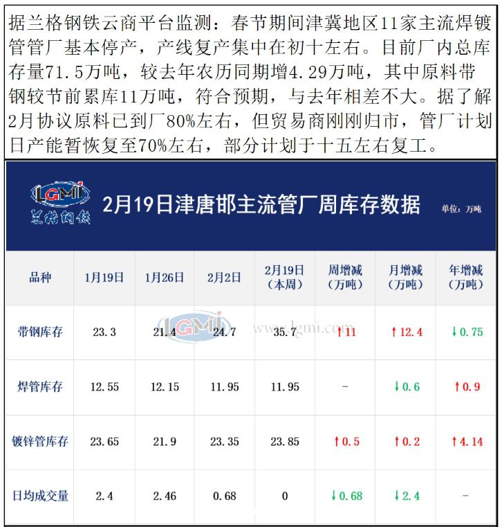 兰格调研:春节期间焊镀管厂原料累库 产能待提升