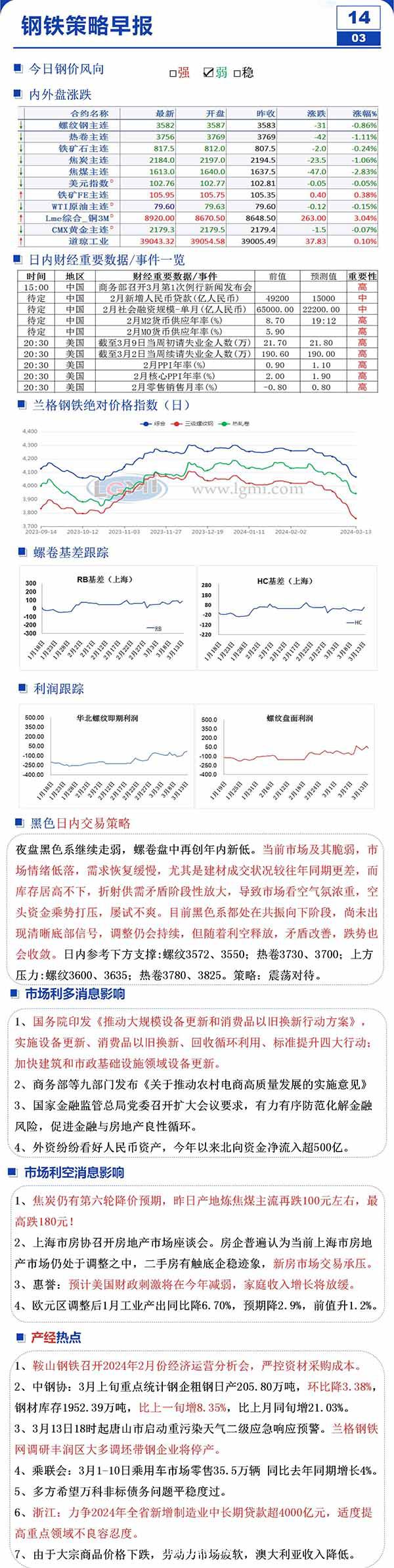 3月14日钢市早知道:螺卷盘中再创新低 国务院实施设备更新、以旧换新等四大行动
