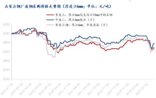 价格方面:3月27日石家庄市场废钢价格6个厚重废2560元/吨,较上月同期2730元/吨下调170元/吨。由于春节前钢厂冬储,加之节后整体行情走势不佳,节后并未如往年一样补库拉涨,尤其是进入三月后,受黑色系期货下行影响,废钢顺应市场节奏,跌至年内低点,3月20日以后期货翻红提振市场,价格有所拉涨,在成材价格反弹的情况下,废钢市场情绪转变,出货速度放缓。本周来看,随着黑色期期货再度走弱,废钢亦受其影响,市场情绪不佳,商家卖跌不卖涨心态凸显,需结合盘面和整体到货情况,观望后期市场价格。