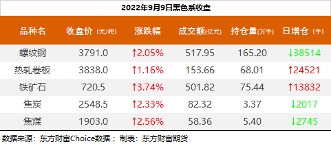 截至9月9日收盘,螺纹钢2301收3791元/吨,涨2.05%;热卷2301收3838元/吨,涨1.16%;铁矿石2301收720.5元/吨,涨3.74%;焦炭2301收2548.5元/吨,涨2.33%;焦煤2301收1903元/吨,涨2.56%。