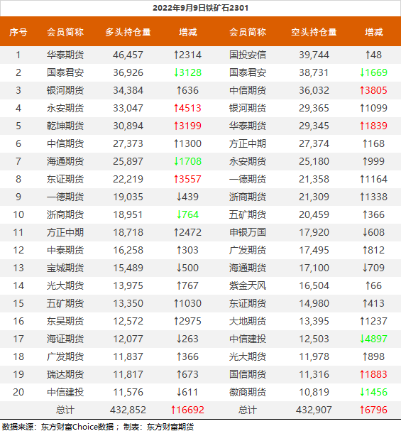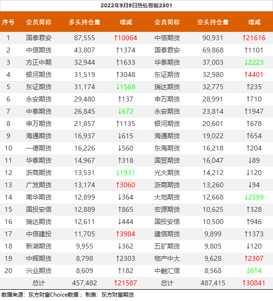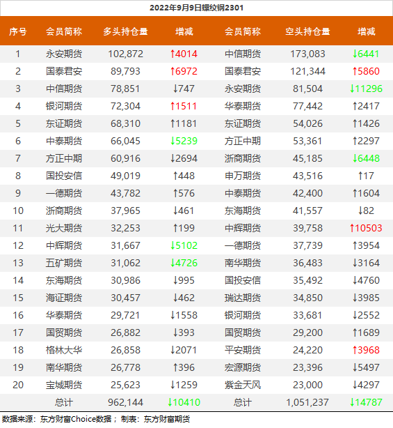螺纹钢2301合约前20席位多单减仓10410手至96.2万余手,空单减仓14787手至105.1万余手,整体净空89093手。其中永安期货多单增持4014手,空单减持11296手,整体净多21368手。