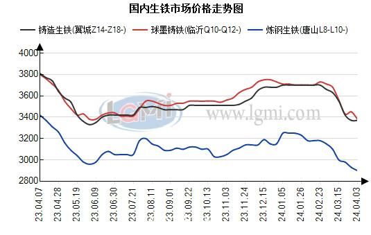 4月3日国内生铁市场弱稳观望。据兰格钢铁网监测数据显示,炼钢生铁(L10):唐山地区报2900元,较上一交易日持平;翼城地区报3110元,较上一交易日持平;临沂地区报3060元,较上一交易日持平。铸造生铁(Z18):翼城地区报3370元,较上一交易日持平;徐州地区报3400元,较上一交易日持平;淄博地区报3260元,较上一交易日持平。球墨铸铁(Q12):翼城地区报3380元,较上一交易日持平;徐州地区报3410元,较上一交易日持平;临沂地区报3380元,较上一交易日持平。