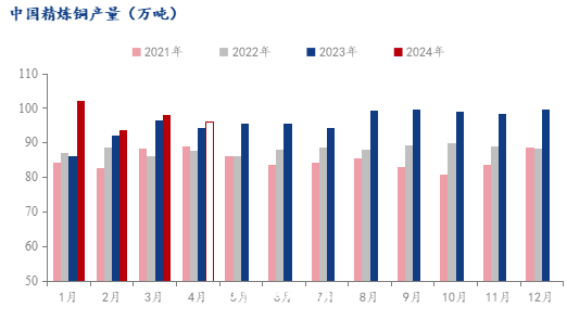 根据Mysteel调研国内50家电解铜生产企业,涉及精炼产能1453万吨(含2024年新增产能)样本覆盖率98.38%得出:2024年3月国内电解铜实际产量98.05万吨,环比增加4.9%,同比增加1.47%。另据调研企业的生产计划安排来看,2024年4月国内电解铜预计产量95.94万吨,环比减少2.15%同比增加1.55%。从跟踪调研的检修情况来看,今年是检修高峰年,3-6月的预期检修影响量都是近三年的最高值,其中西南某冶炼厂搬迁影响量最为明显。目前我网跟踪到企业里,5家企业计划或已经开始进行提前检修。至于大面积安排提前检修的计划可能性较小,主要是检修材料的到货时间不定,部分材料需要进口,因此很难出现大面积的冶炼厂提前检修。但考虑到新投产能的释放,实际产量表现是不及预期的。
