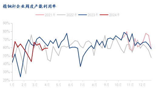 以铜杆市场为例,市场铜杆企业生产难度较大,根据Mysteel铜杆团队跟踪调研的数据来看,近期精铜杆企业周度产能利用率提升较为缓慢,且不及去年同期,甚至在当下旺季出现环比下滑的状态,精铜端消费压力较大。